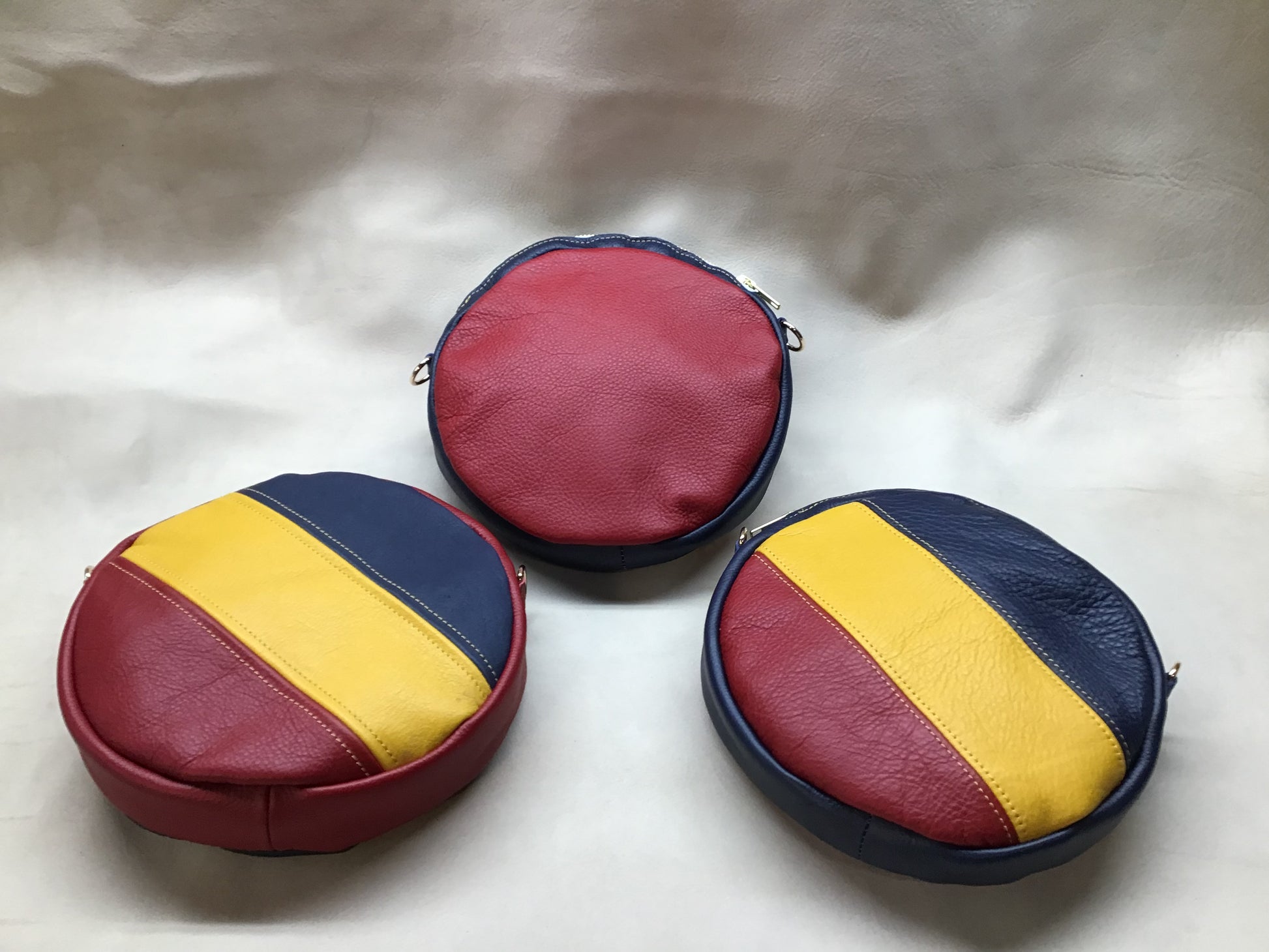 Custom Design, Color Blocked Crossbody Bag. Perfect to carry the essentials while out on the town. Designed with the free spirit adventurer in mind. The round design and custom colors make this bag a statement piece and are sure to garner attention. Made from genuine leather and lined with woven tartan plaid. Can be customized with either a leather strap or a custom handwoven strap.